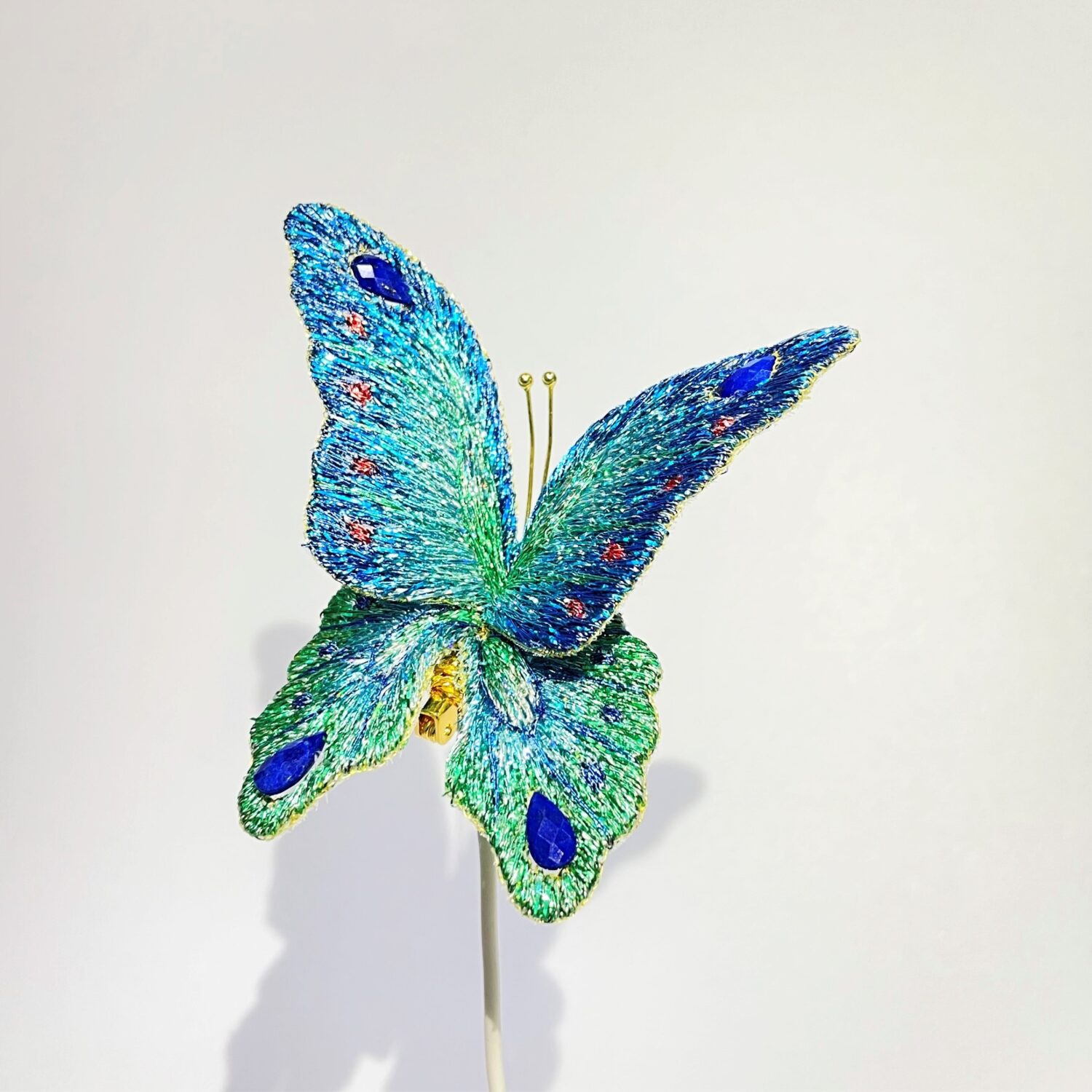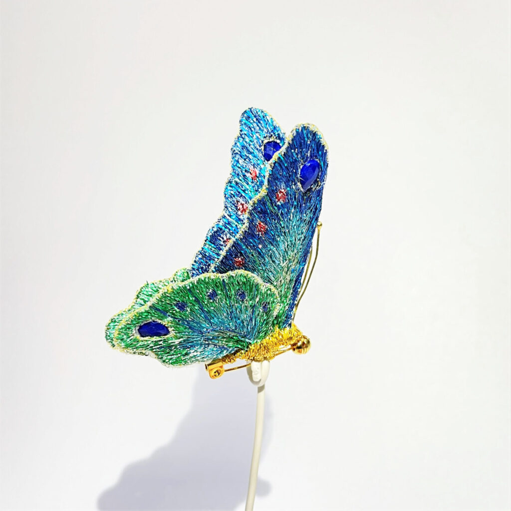 We could reproduce their thin, powdery, silky wings using colored-gold threads, lame yarn, and fine, shiny single-strand threads with wires inside.